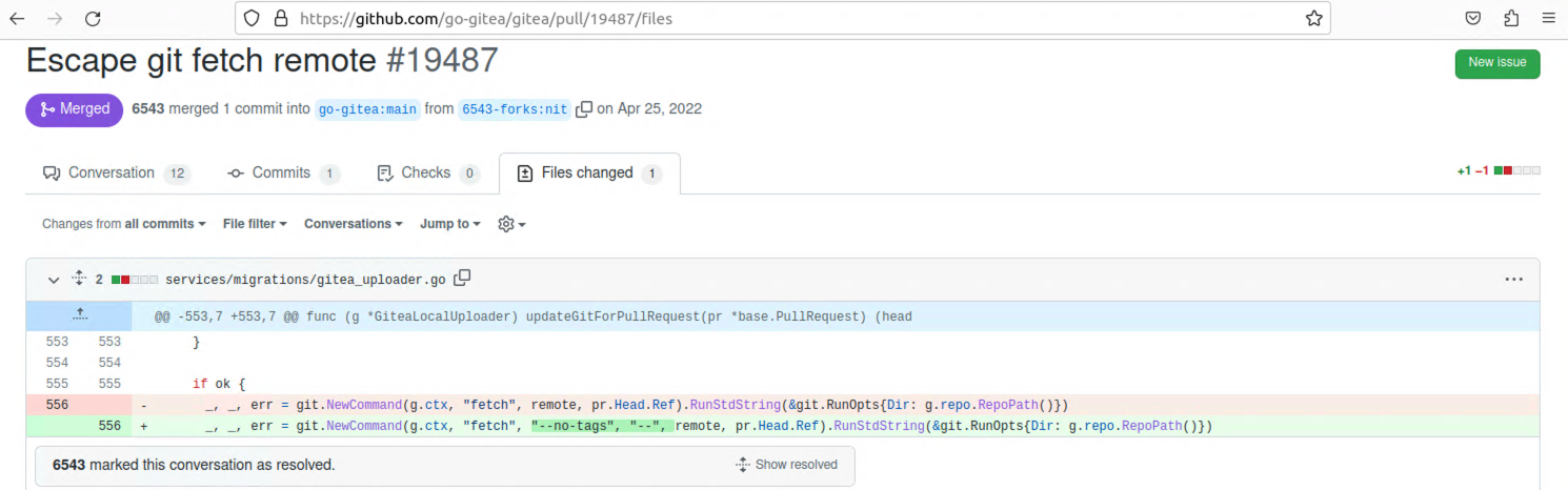 Reading up a little bit on this CVE we can see that this version of Gitea is failing to escape remote URL fetching. Because Gitea is an open-source project we can easily check the commits to see which files were changed and how.